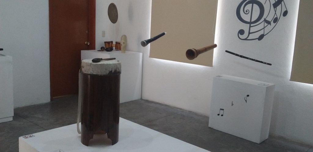 Entre los instrumentos que se pueden apreciar, se encuentran algunos de viento como clarinetes, trompetas, trombones, chirimías y saxofones y otros de percusión como maracas, bongos y un güiro, así como el “huehuetl”, situado al centro de una de las salas, se trata de un tambor de madera en forma de tubo con un parche de cuero en la parte superior que a medida que se golpea y la temperatura en el material incrementa, puede emitir sonidos que varían en grado de intensidad y agudeza.