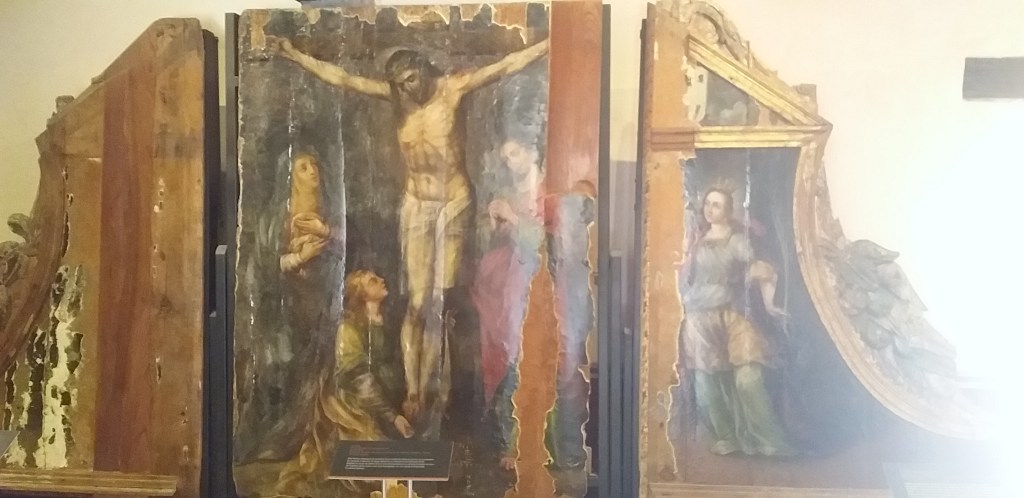Continuando con el recorrido, se rodea el claustro hasta encontrar un acceso que conecta con el interior del convento, de inmediato el fragmento de un retablo de finales del siglo XVI da la bienvenida. Se trata de una obra de alrededor de dos metros de alto, seccionada en tres partes, la del centro es una imagen de Jesucristo crucificado, y la de la derecha, un retrato de Catalina de Alejandría, la otra parte se ha desgastado, perdiendo visibilidad. Fue recuperada del antiguo convento de San Francisco en el municipio de Tepeyanco.