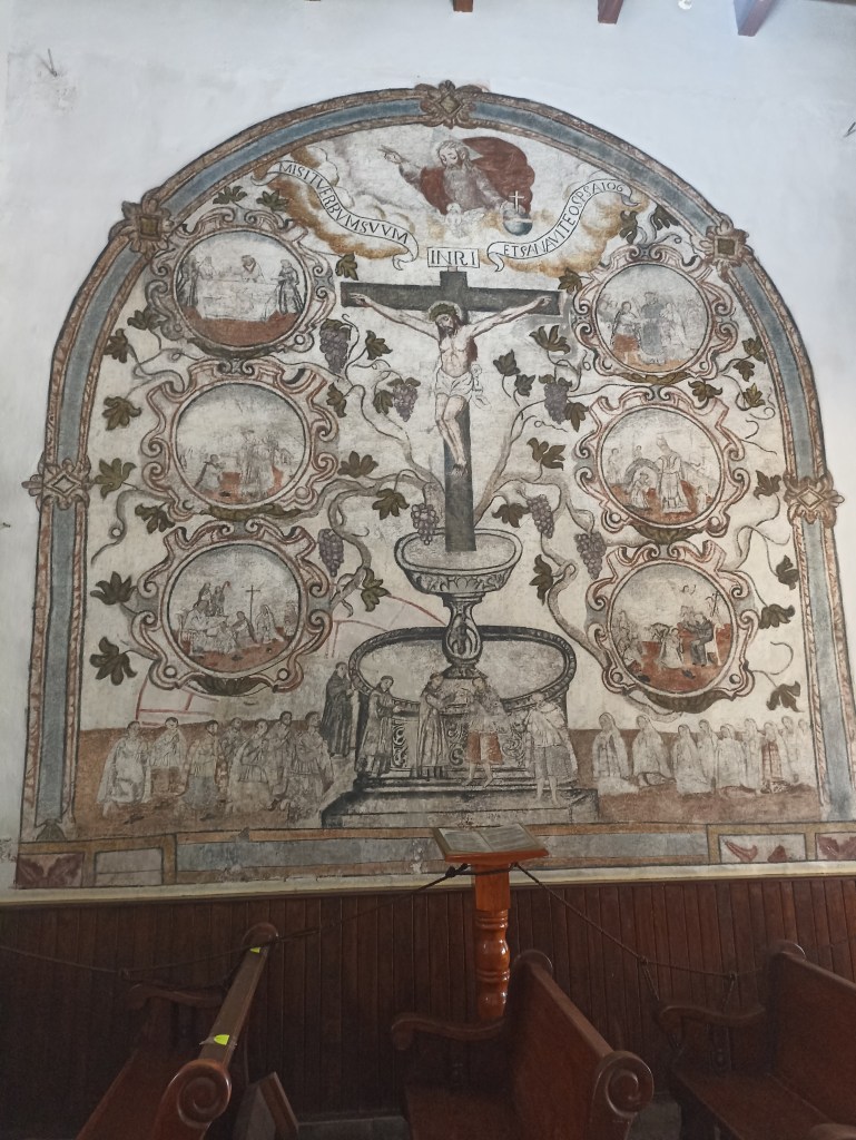 Continuando con la explicación, se llega a una de las partes más relevantes de este nuevo espacio cultural: el mural de la alegoría de los siete sacramentos. A pesar de que no se tiene información de la autoría, se conoce como uno de los elementos culturales más importantes del Valle de Teotihuacán, esto debido a su antigüedad.