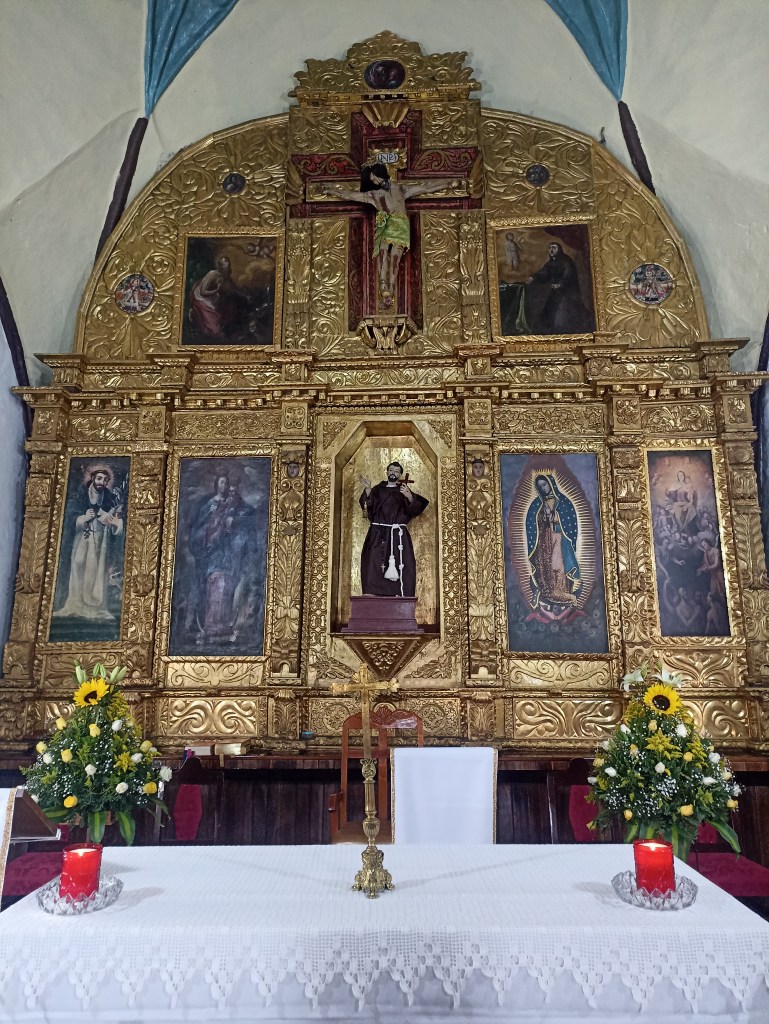 Por último, el retablo/presbiterio muestra un trabajo similar a la catedral de Tlaxcala, aunque sea de un mayor tamaño a comparación del templo de San Francisco de Asís en cuanto a su distribución arquitectónica; dentro de este retablo, se encuentran integradas varias pinturas, algunas de las cuales han sido robadas y fueron sustituidas por réplicas con el pasar del tiempo. Creado en el siglo XVIII, y sin autoría documentada, el retablo es considerado, desde un aspecto más religioso, como el punto más fundamental de toda la parroquia, debido a que en él se encuentra la imagen del santo patrono de la población.