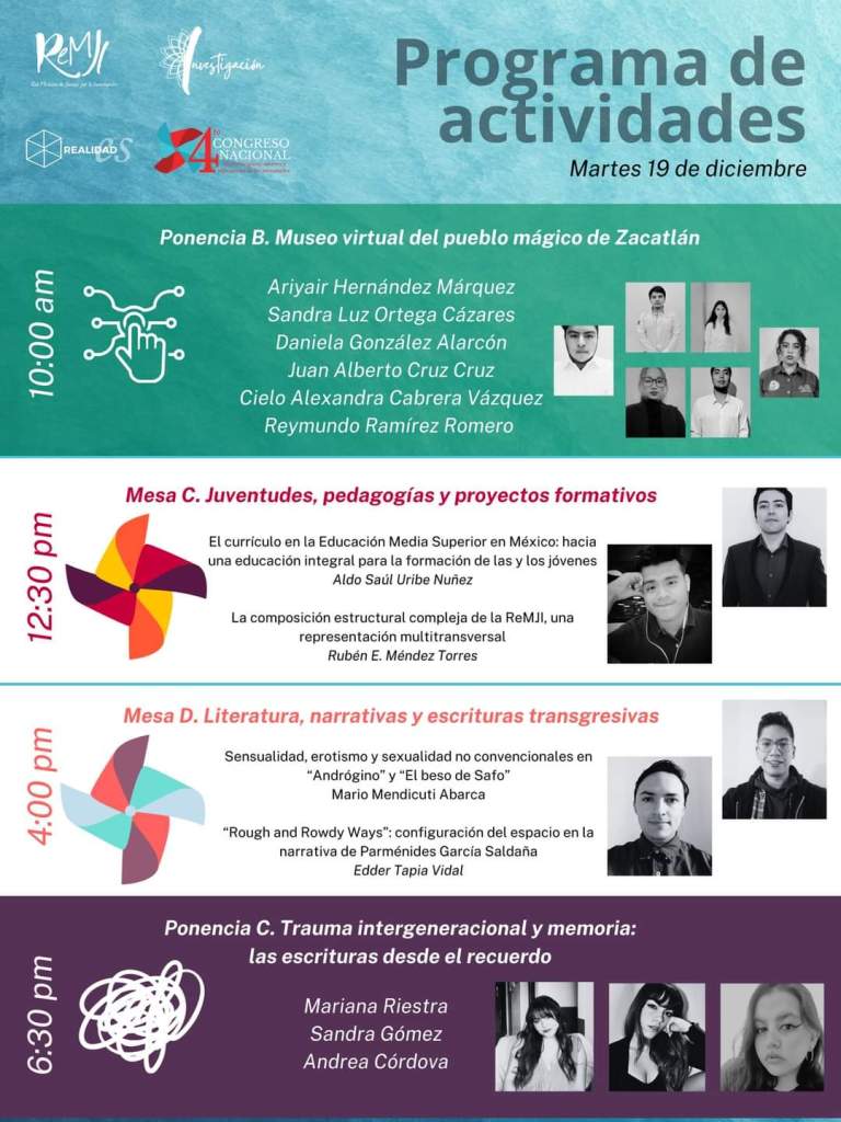 Después de cuatro años de haberse consolidado como un macroproyecto a nivel nacional, la Red Mexicana de Jóvenes por la Investigación (ReMJI) ha diseñado, organizado y llevado a cabo su 4to Congreso Nacional bajo el eje temático “Multidisciplina, saberes y reflexiones de las juventudes”. Es de reconocer que tan magno evento ha sido fruto de diversidad de interacciones multi-transversales en donde se contiene el ánimo, dedicación, profesionalismo y entereza de toda la Comunidad de la ReMJI, así como de aquellas personas invitadas y colectivos que hicieron posible la realización de todas las actividades académicas distribuidas a lo largo de cuatro días.